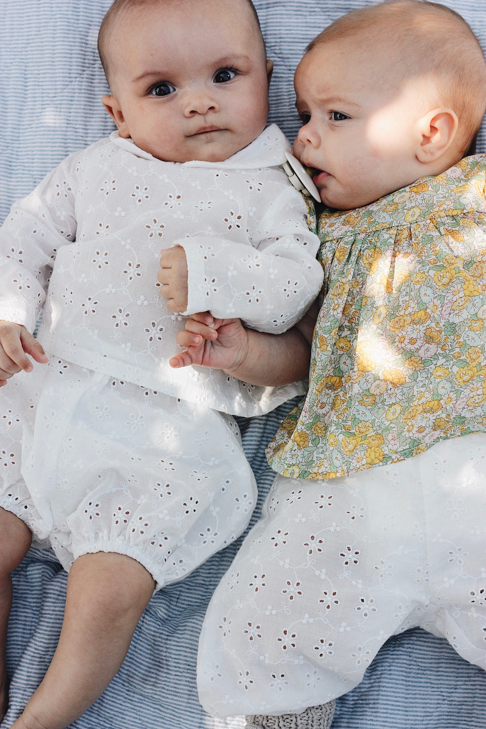 The Vilja set is easy to wear for all little babies and toddlers. A cute set in your little one's wardrobe and adds instant cuteness. A baby shirt with a cute collar and bloomers. Both made from the softest 100% organic cotton. Can be used with a body and tights underneath on colder days.